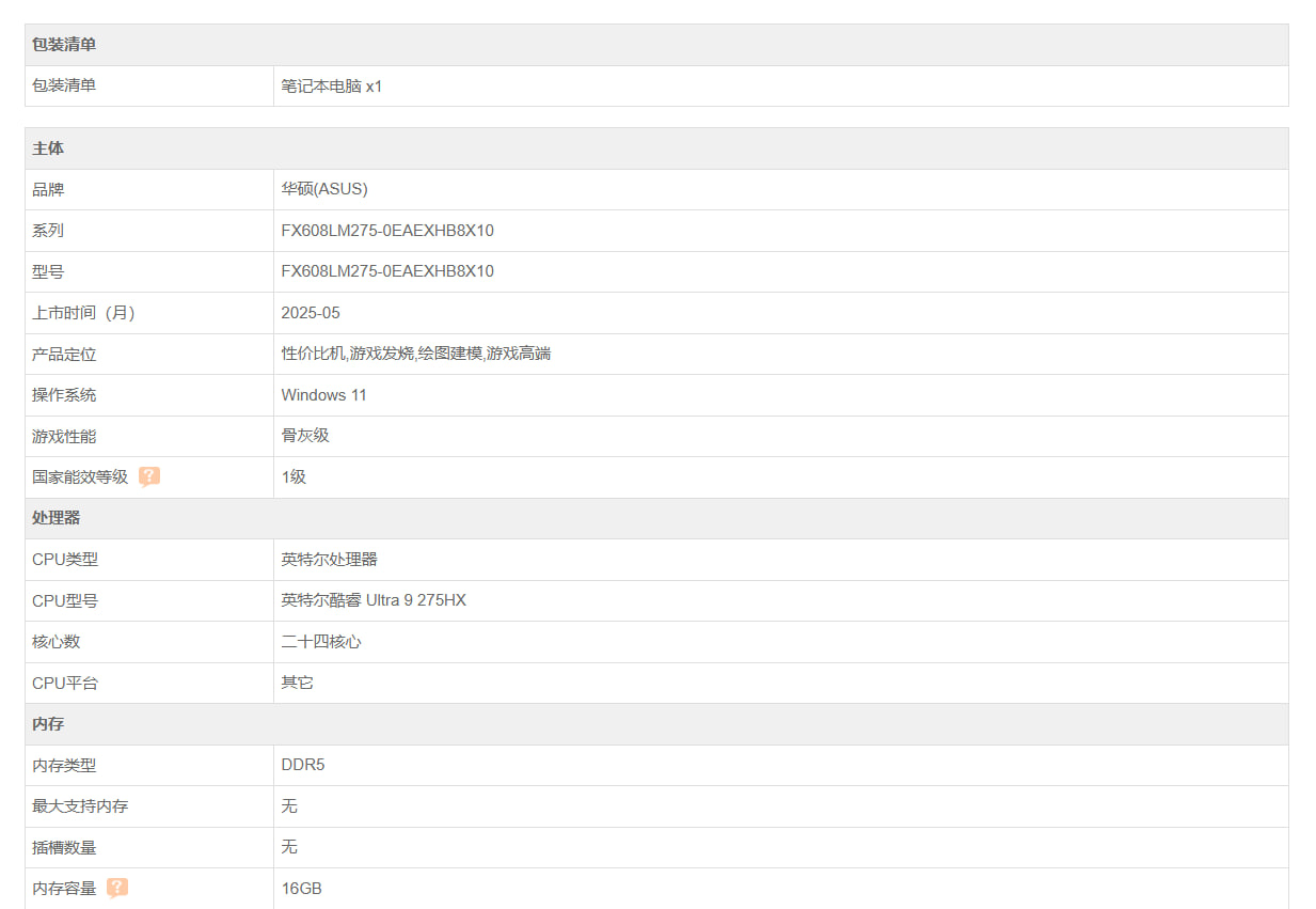 华硕天选6 Pro 酷睿版Ultra 9 16英寸275HX 16G 1T RTX5060 2.5K 日蚀灰